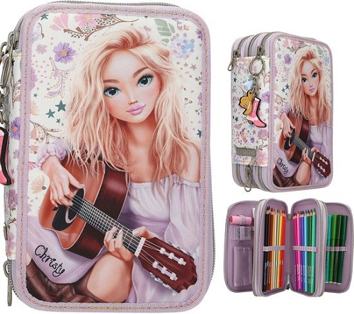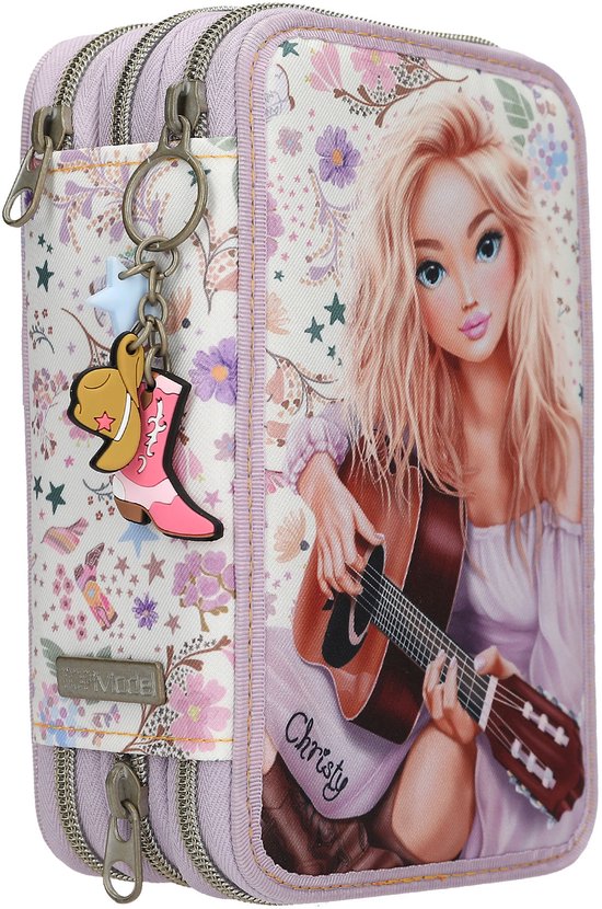 Cowgirl cool: de crèmekleurige TOPModel etui met lichtpaarse details heeft een grote romantische modellenafbeelding met een gitaar op de voorkant. Deze is omringd door een delicaat patroon van kleine bloemen, bladeren en cowboylaarzen. Aan de rits hangt een cowboyhoed, -laars en ster.