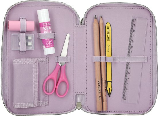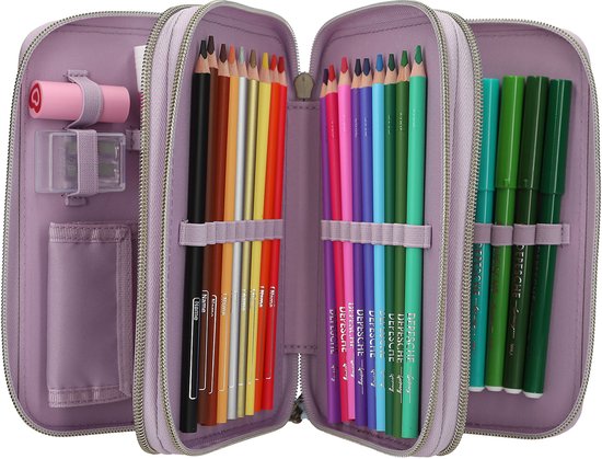 De drie aparte vakken zijn volledig gevuld met 18 kleurpotloden, 18 viltstiften, 2 potloden, een gum, puntenslijper, liniaal, schaar, lijmstift en klein vakje met klittenband.