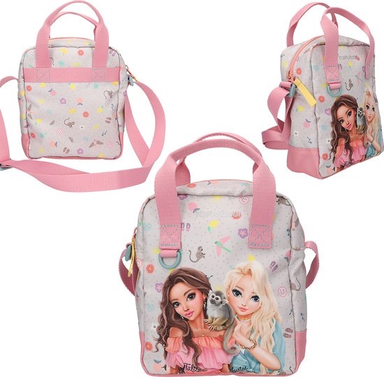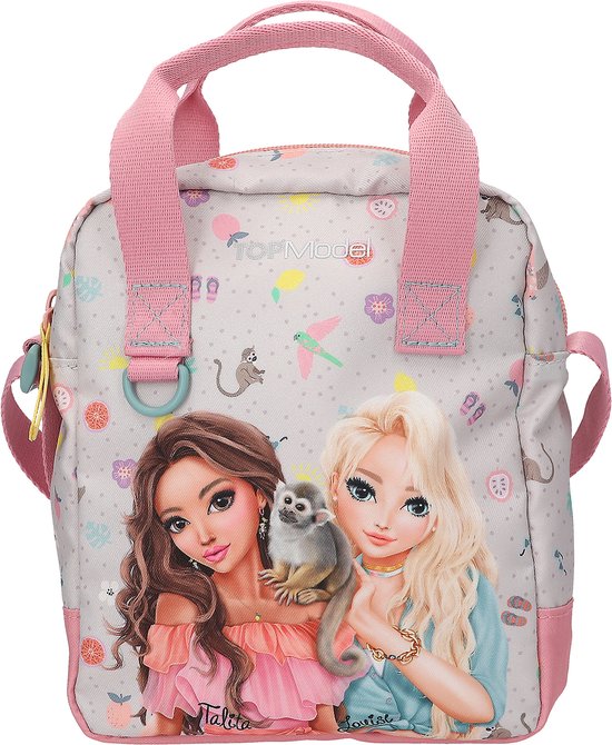 Beestachtig fruitig zoet: de TOPModel schoudertas Juicy heeft op de voorkant een grote modellenafbeelding met een aapje en rondom een vrolijke print van kleine stippen, bloemetjes, fruit, apen, vogels, palmen en zomerse accessoires.