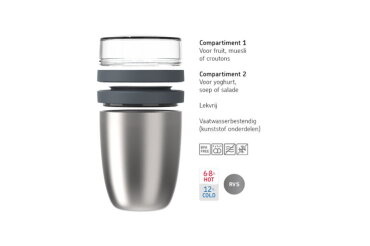 Altijd tijd tekort in de ochtend? Herkenbaar. Neem voor onderweg de isoleer lunchpot Ellipse in Nordic green mee met frisse yoghurt en granola (handig, want die blijft lekker knapperig in de deksel!). In de dubbelwandige roestvrij stalen pot blijft je