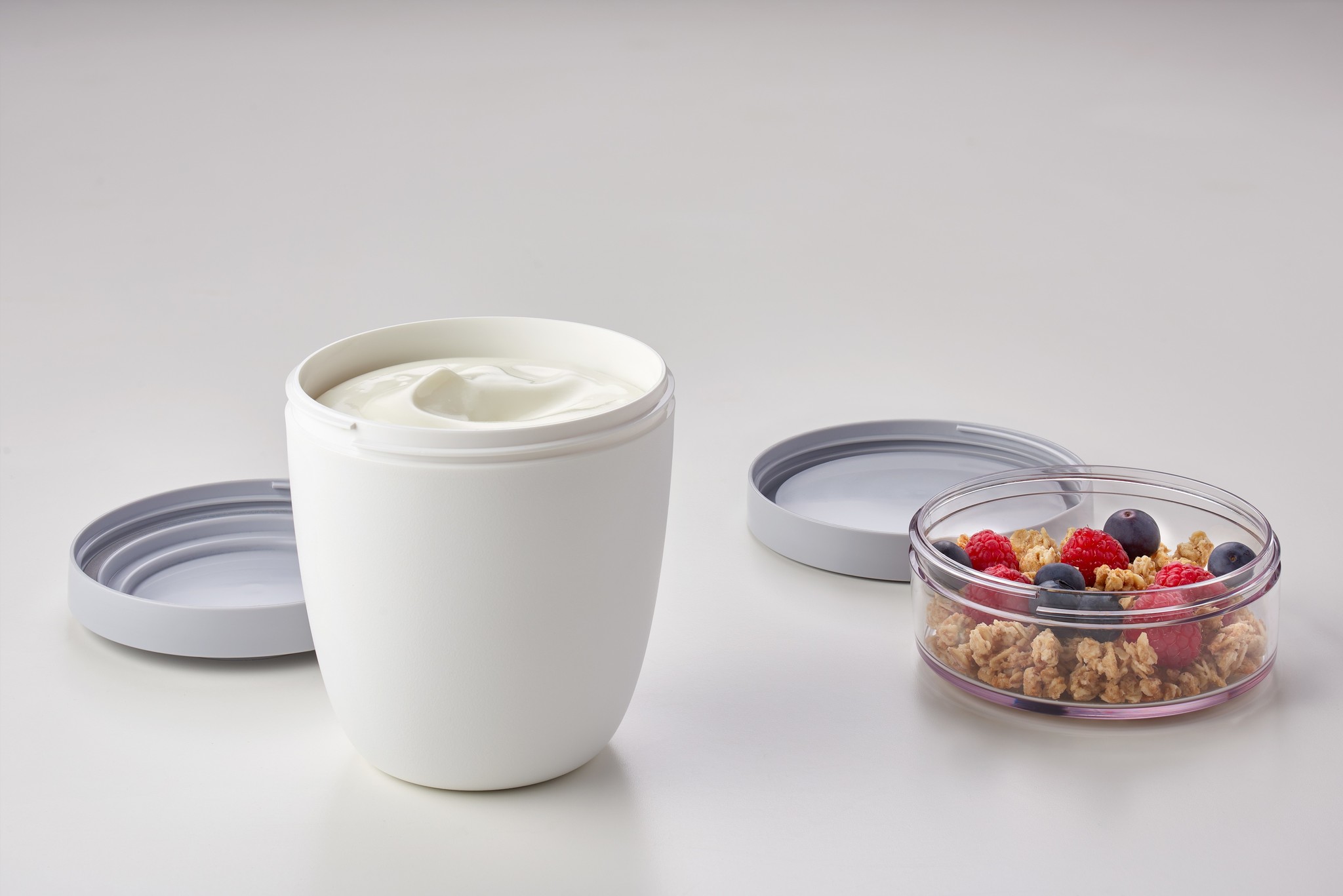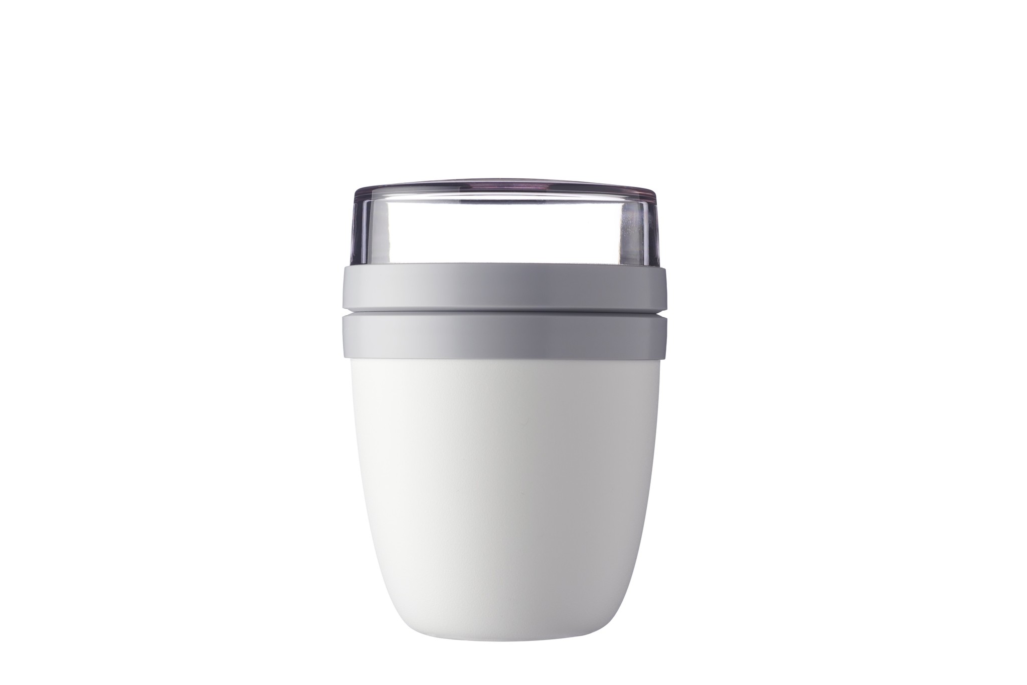 Lunchpot Ellipse in de kleur wit. Deze witte Ellipse lunchpot van Mepal is één handig product om je lunch of tussendoortje mee te nemen, maar heeft twee verschillende compartimenten om de verschillende ingrediënten gescheiden te houden. Bijvoorbeeld de yoghurt en de muesli of fruit zitten in een aparte container, waarbij de deksel van de yoghurtbeker niet de bodem van de mueslicontainer is. Door middel van een eenvoudige draaibeweging scheid je de twee compartimenten om de ingrediënten te mixen. Dé oplossing om geknoei tijdens het mengen te voorkomen. Het is de eerste oplossing die super makkelijk is in het gebruik.