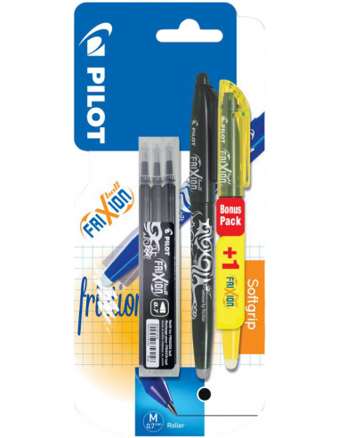 Pilot FriXion Rollerball 0,7mm - zwart + 3 vullingen + 1 FriXion Fluo geel