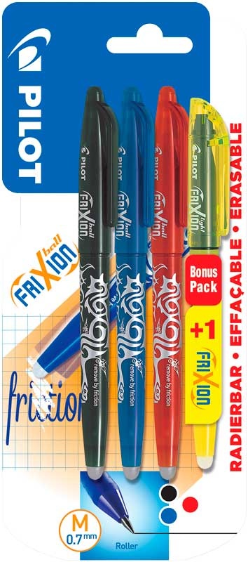 Pilot FriXion Rollerball 0,7mm – zwart/blauw/rood + 1 FriXion “Light” geel