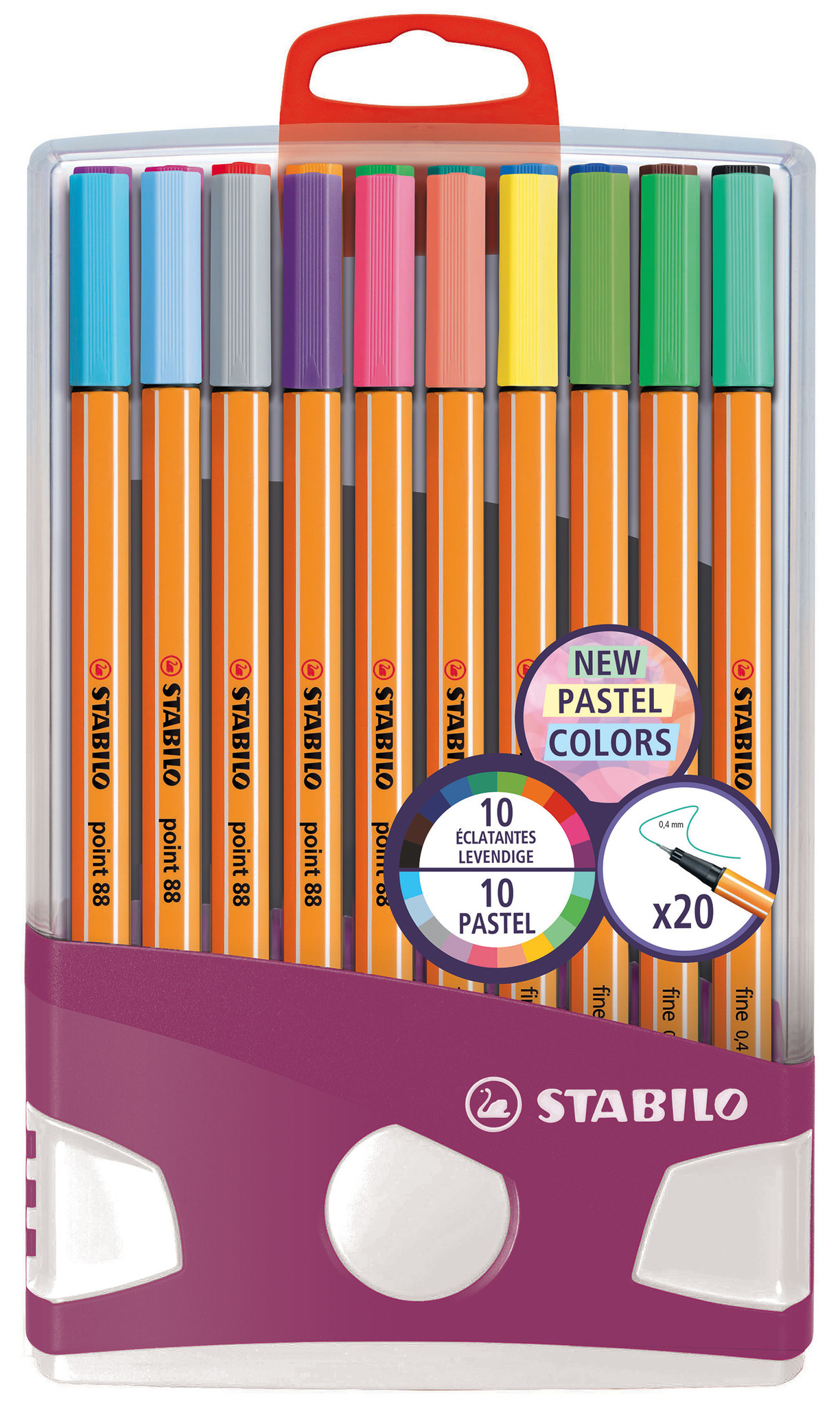 STABILO point 88 PastelParade met 20 fineliners. 10 pastel kleuren + 10 heldere kleuren.Herbruikbare PastelParade. Praktisch om je fineliners overal op te bergen en mee te nemen! STABILO point 88, de fineliner met een fijne punt (lijnbreedte 0,4 mm), v