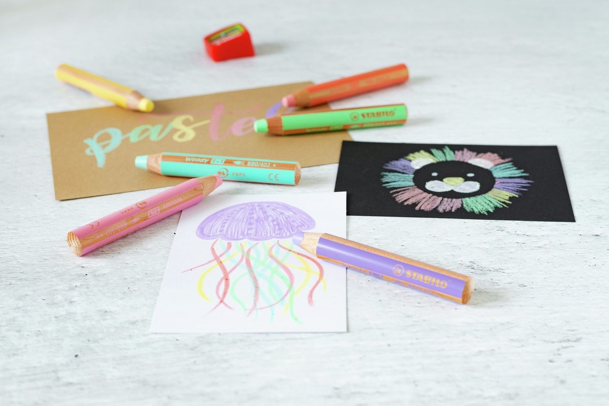 Met de STABILO woody 3 in 1 kan zowel op papier of karton als op gladde oppervlakken, zoals ramen, kunststof, regenlaarzen, broodtrommels, leer en steen worden gekleurd. Dekt zelfs op zwarte ondergronden. Met een kwast en water erbij kunnen prachtige kunstwerken worden gemaakt. De woody 3 in 1 kan weer heel gemakkelijk van harde, niet poreuze, gladde oppervlakken worden verwijderd, zoals ramen.
