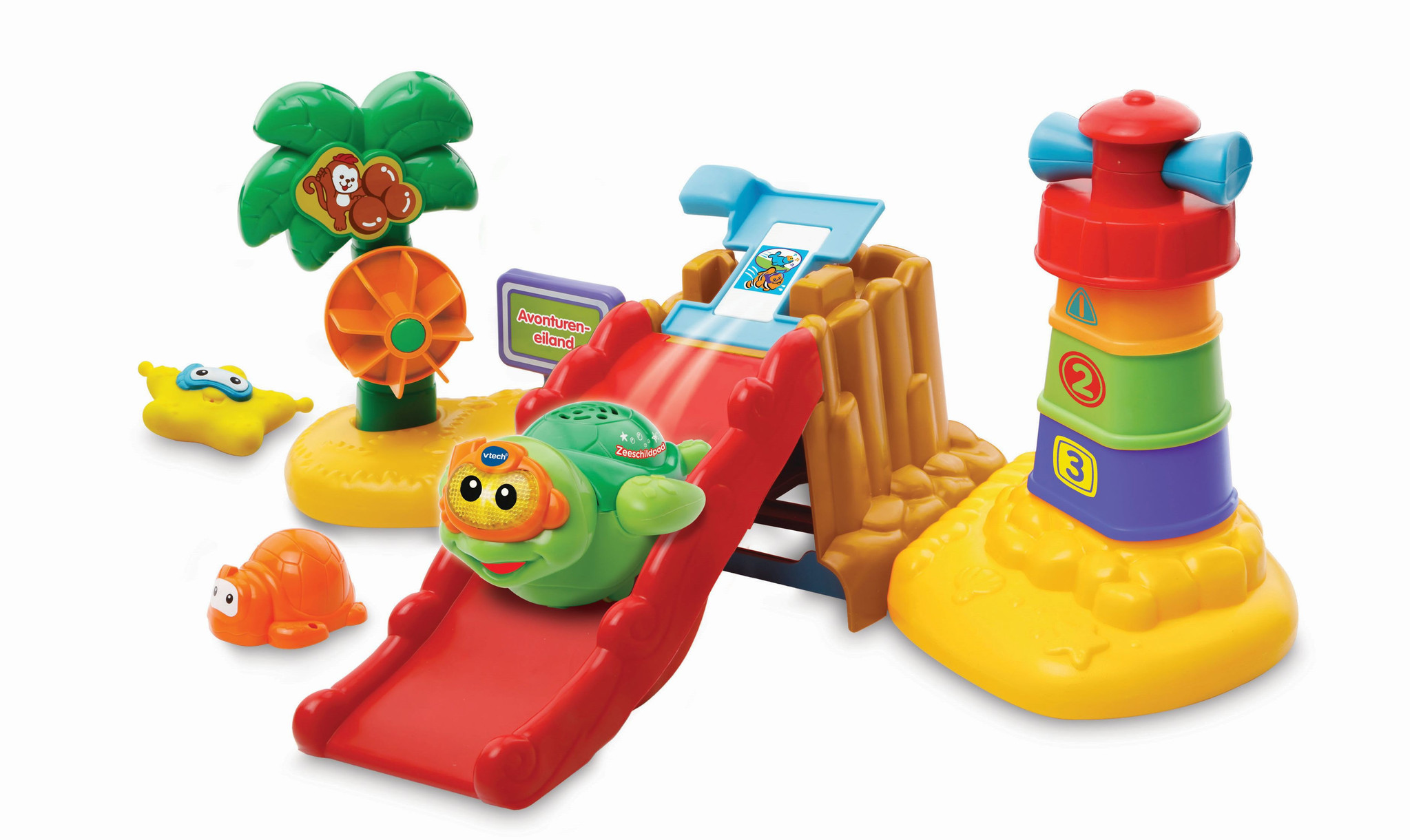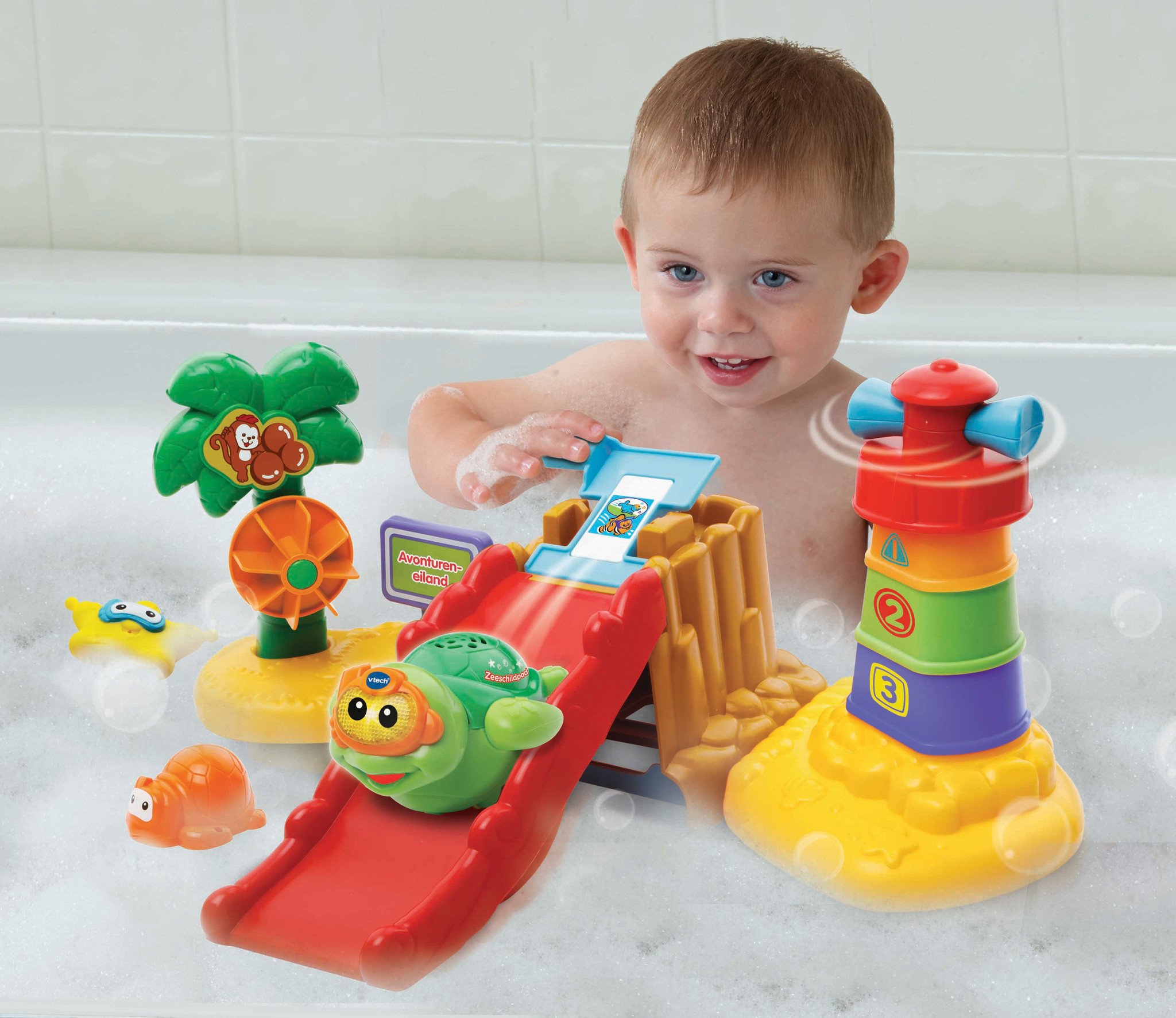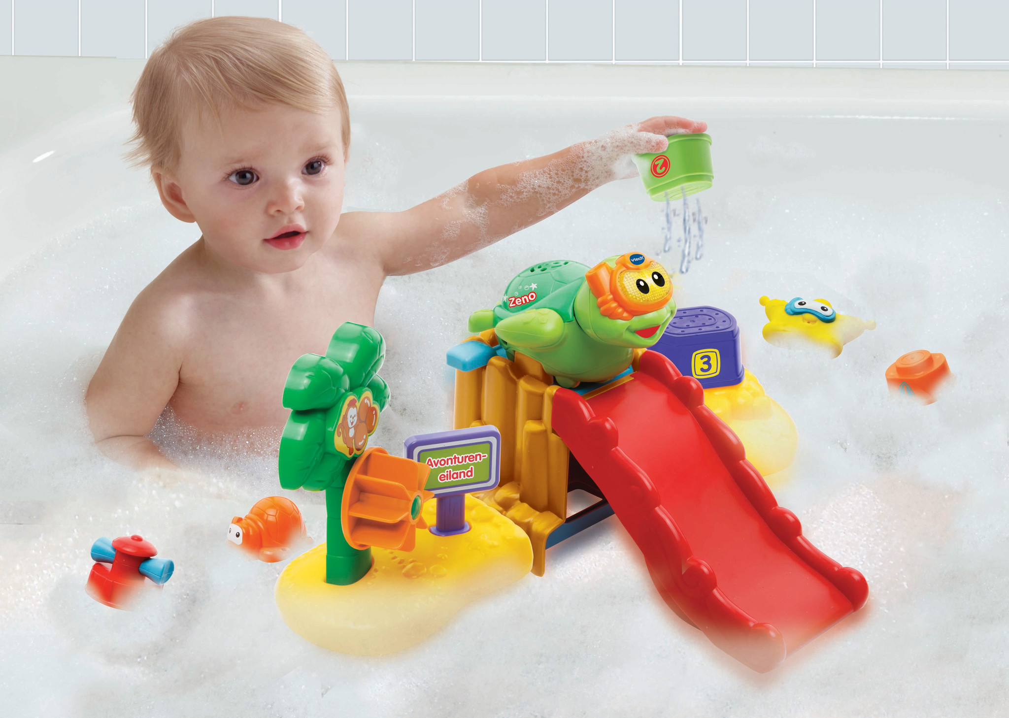 Dit eiland drijft op het water en neemt kleintjes mee op ontdekking! Plaats Zeno Zeeschildpad of een ander Blub Blub Bad bootje of diertje (apart verkrijgbaar) op het Splash Point van de lanceerder en luister naar de vrolijke reacties. Beweeg de lanceerde