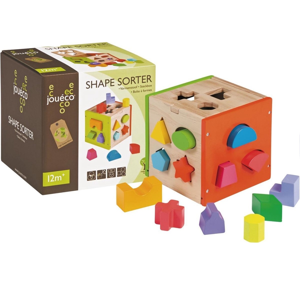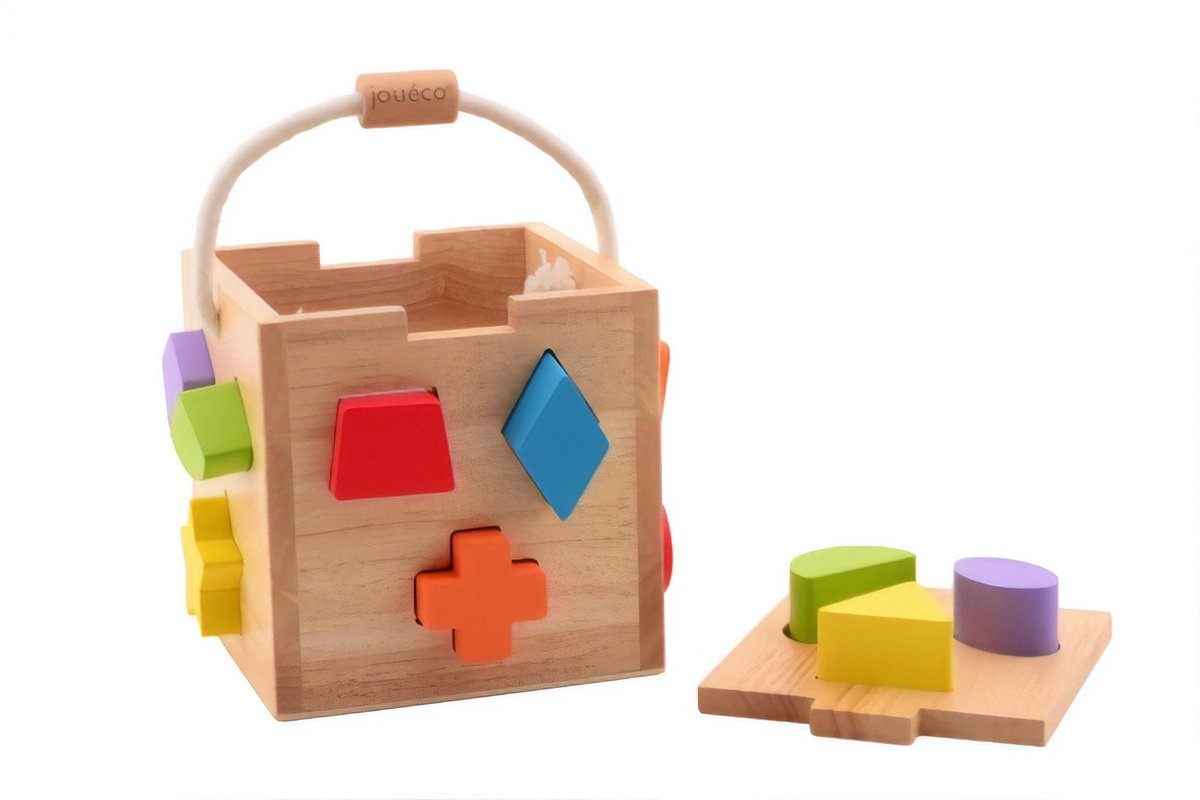 Zoek de juiste vorm in de deksel en aan alle zijkanten om de houten blokken in de vormenstoof te krijgen. Jouw kindje leert hierdoor vormen herkennen.