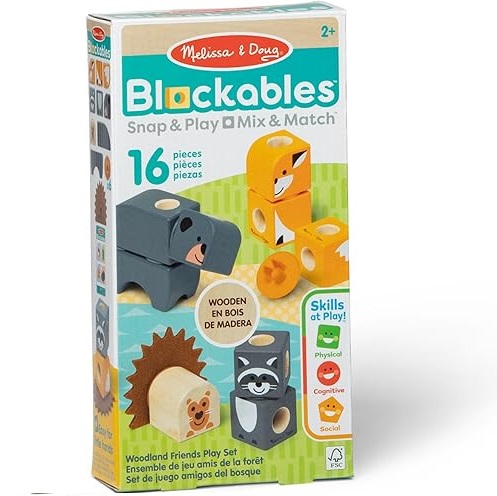 Melissa & Doug Blockables zijn koppelbare, stapelbare en speelbare bouwblokken van massief hout, perfect voor kleine handjes en een grote fantasie. Dankzij speciale verbindingsstukken kunnen kinderen vanaf 2 jaar eenvoudig soepele, kleurrijke blokken aan elkaar klikken om leuke bosdieren te creëren om mee te spelen, of om te combineren en hun eigen gekke personages en coole creaties te bouwen.