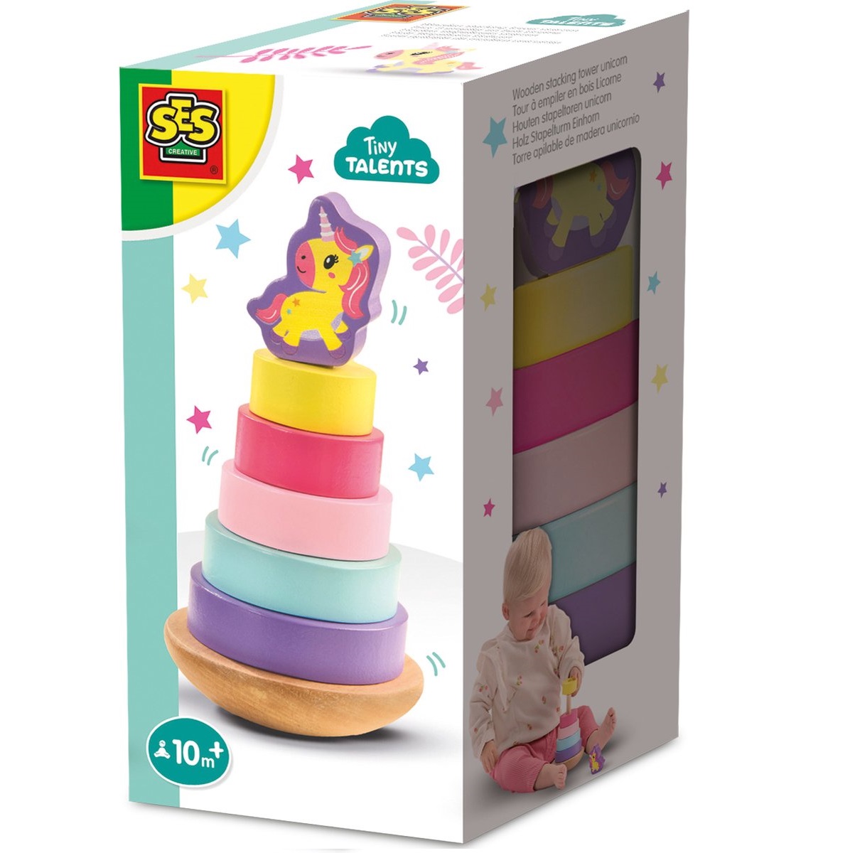 Stapelen, leren en ontdekken – met de Houten Stapeltoren Eenhoorn van SES Creative wordt spelen een leerzaam avontuur! Deze vrolijke stapeltoren met een schattige eenhoorn als topper bestaat uit vijf kle