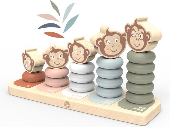 Ontdek het stapelbaar speelgoed Monkey family van Speedy Monkey, een houten ontwikkelingsspeelgoed met stapelstukken om de behendigheid van uw kind te ontwikkelen. Een speelse cadeau voor kinderen vanaf 1 jaar. Kom bouwen en spelen met onze vrolijke apenfamilie! Dit speelgoed bevat vijf schattige stapelapen, elk met onderscheidende kenmerken om de vader, moeder, broer, zus en de baby te identificeren. Elke stapelstaaf is stevig bevestigd. Uw kleintje leert assembleren en tellen door verschillende maten en kleuren te verkennen. Een ideaal cadeau om de creativiteit en behendigheid van de allerkleinsten te ontwikkelen.