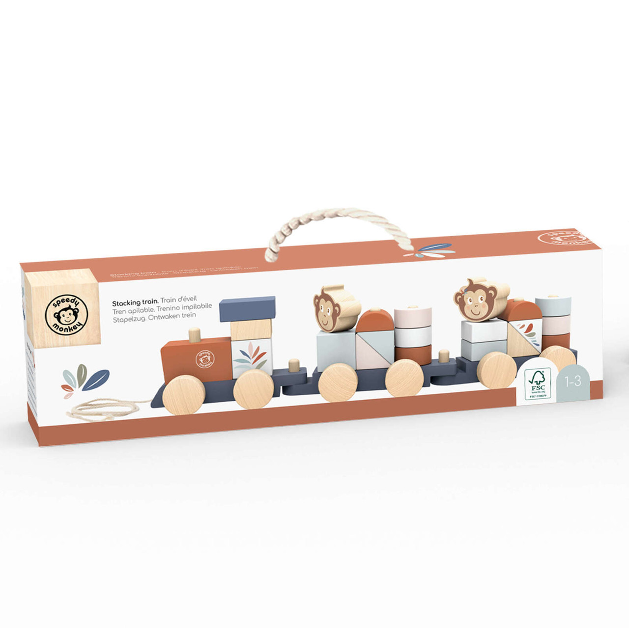 Een leuk houten trektrein stapelaar, geschilderd in trendy zachte kleuren en met onze favoriete karakter, de aap. Je kleintje zal urenlang plezier hebben met het stapelen van elementen op de trein en het bouwen van huizen met kleurrijke blokken. Zodra ied