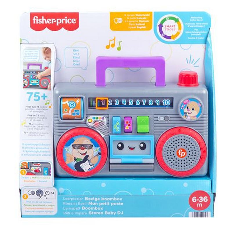 De coole tunes die uit de gettoblaster komen, leren je kind het alfabet, cijfers, kleuren en meer. Je baby kan ook aan de zenderzoeker draaien, de schakelaars indrukken en ermee bewegen of het cassettedeck open- en dichtmaken. Dankzij de meegroeitechnologie in dit draagbare activiteitenspeeltje kun je het leermateriaal aanpassen aan de leeftijd en het niveau van je baby.
