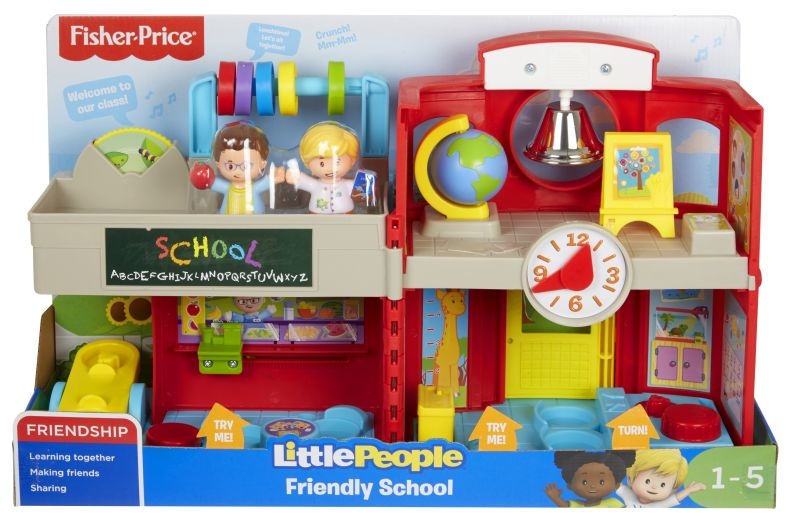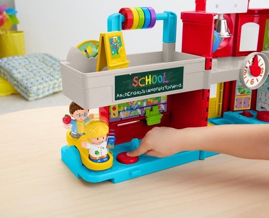 Op de Little People® Vriendelijke School kun je nieuwe vriendjes en vriendinnetjes maken en heel veel leren en ontdekken! Met deze interactieve speelset kunnen kleintjes het alfabet oefenen en leren tellen met Eddie™, en daarbij ontdekken hoe leuk het is om dingen te delen, om de beurt dingen te doen en vriendjes te maken. Ontdekkingsknoppen brengen de school tot leven met liedjes, geluiden en zelfs een echte wip! Kleine dingen die een groot verschil maken Fijne motoriek: Door de figuurtjes vast te pakken en te reageren op de activiteiten van de speelset, bijvoorbeeld door de wereldbol rond te draaien en de bel te laten rinkelen, worden kleintjes behendiger en verbeteren ze hun oog-handcoördinatie. Relatievaardigheden: Met de vrolijke liedjes en zinnetjes leert je kleintje over begroetingen, omgangsvormen en het maken van vriendjes. Nieuwsgierigheid en verwondering: Kleuters komen erachter hoe leuk oorzaak en gevolg kan zijn wanneer ze ontdekken hoe ze leuke dingen kunnen laten gebeuren door op de ontdekkingsknoppen te drukken.