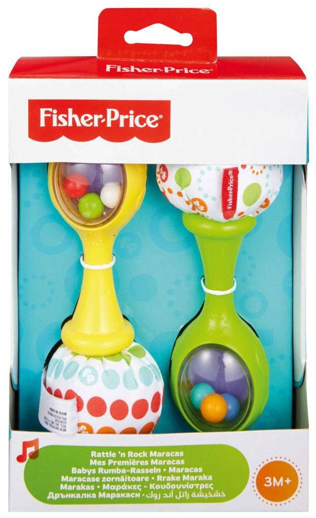 Een set van twee maraca’s: ritme-instrumenten voor de allerkleinsten om muziek te maken. Elke maraca is aan één kant voorzien van een raampje met kleurige rinkelkralen. De andere kant heeft een vrolijk bewerkt motief.