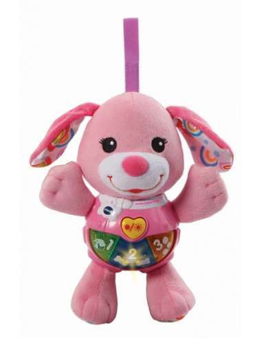 Druk op de knipperende toetsen om vrolijke zinnetjes, grappige geluiden, melodietjes en gezongen liedjes te horen. De lieve puppy laat je kennismaken met cijfers en voorwerpen. Het riempje met klittenband zorgt ervoor dat je de puppy eenvoudig overal mee