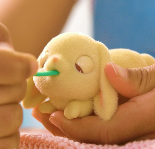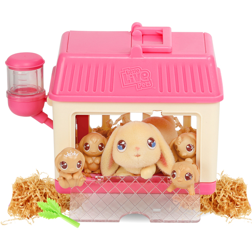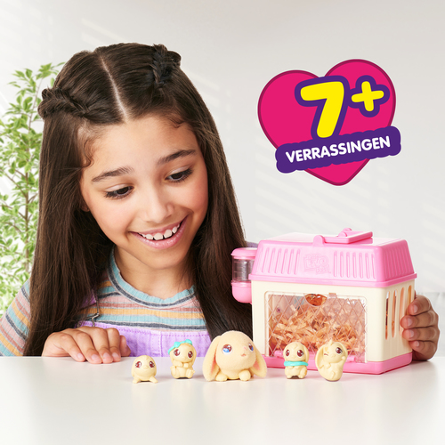 Heb jij altijd al een konijntje willen hebben? Kijk eens hoe schattig dit kleine konijntje in haar roze minihokje is! En dit konijntje wordt mama… maar wanneer? Verzorg mama goed en voed haar met de selderij en haar oogjes zullen sluiten. Zet haar dan op het stro in haar hokje en sluit de deur. Vul de waterfles en kijk hoe het water verdwijnt! Nu is ze klaar om op magische wijze maar liefst 3 baby’s te krijgen! Deze schattige babykonijntjes hebben verschillende poses en worden geleverd met verrassende accessoires, een strik of een slabbetje. Vergeet je niet de geboorteakte in te vullen?