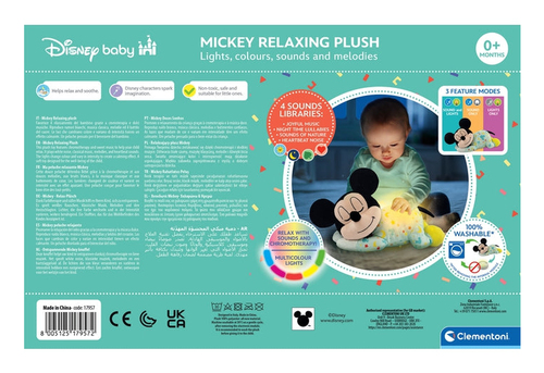Clementoni Disney Baby Mickey relax-knuffel is een zachte, interactieve knuffel die de allerkleinsten stimuleert met licht en geluid. De knuffel is ontworpen om veilig en speels contact te bieden, terwijl het kind wordt geprikkeld in zijn zintuiglijke ontwikkeling.