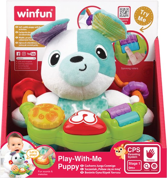 Pup speelt met mij • Pluche puppy met afneembare activiteitenring en gekreukelde kiekeboe-oren. • Kleurrijke activiteitenring met rollers, schuifkraal en tol • Druk en draai aan de cirkelknop en druk op de driehoekknop voor leuke geluiden, vrolijke melodieën en een knipperend licht.