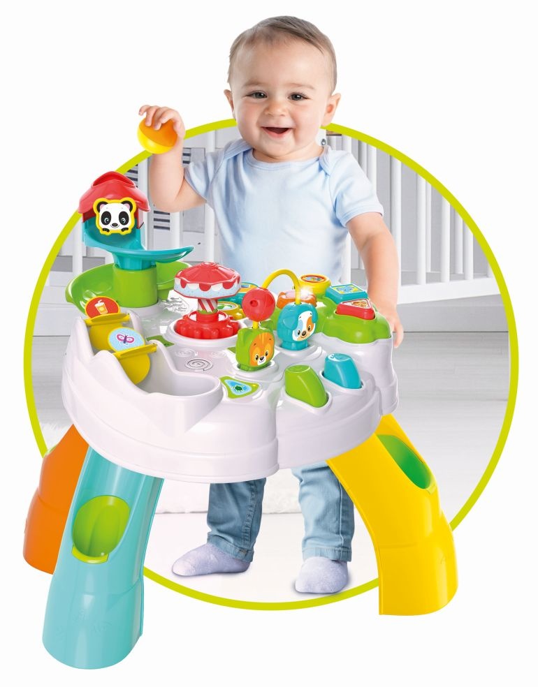 Bevat een leuke route met ballen en glijbanen die eindigt in de voeten van de tafel