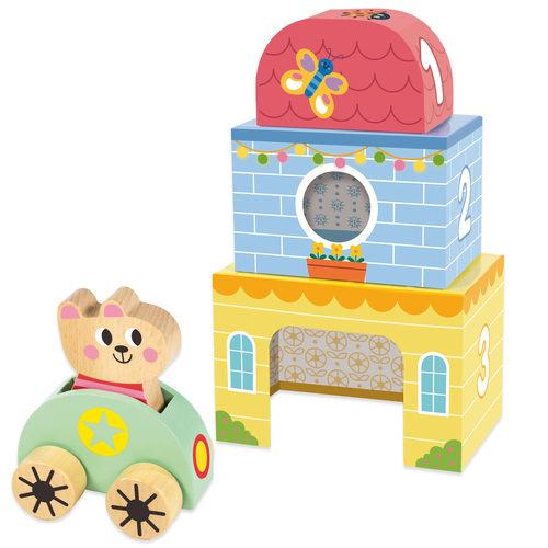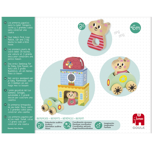 Deze innovatieve set van drie voorwerpen is ontworpen om kinderen door verschillende stadia van hun ontwikkeling te begeleiden, zodat ze kunnen leren op maat van hun groeiende behoeften en vaardigheden. In het begin kan het kind met elk onderdeel afzonderlijk werken en er individueel van genieten en leren. Naarmate het kind groeit en nieuwe vaardigheden ontwikkelt, kan het beginnen met het combineren van de stukken, waardoor een complexere en verrijkende speelervaring ontstaat. Eerst kan het kind genieten van de rammelaar, die gemaakt is van hout en vilt en een aangenaam geluid maakt dat de zintuigen stimuleert. Deze rammelaar is niet alleen leuk, maar helpt ook bij het ontwikkelen van oog – handcoördinatie en handvaardigheid. Vervolgens kan het kind de houten auto gebruiken, een stevig en veilig stuk speelgoed dat is ontworpen om gemakkelijk door kleine handjes vastgepakt te worden. De houten auto stimuleert beweging en verkenning, waardoor het kind in beweging komt en het concept van oorzaak en gevolg begrijpt. Tot slot kan het kind de kartonnen blokken toevoegen aan het spel. Deze blokken zijn licht van gewicht en gemakkelijk te gebruiken, perfect om te stapelen, te bouwen en weer om te gooien. Deze activiteit is niet alleen leuk, maar ook belangrijk voor de ontwikkeling van de fijne motoriek en het probleemoplossend vermogen.