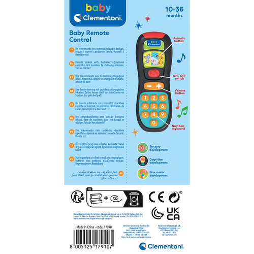 10 toetsen om de eerste nummers te leren, 2 volumeknoppen en 4 grote gekleurde toetsen waarmee het kind dieren leert ontdekken.