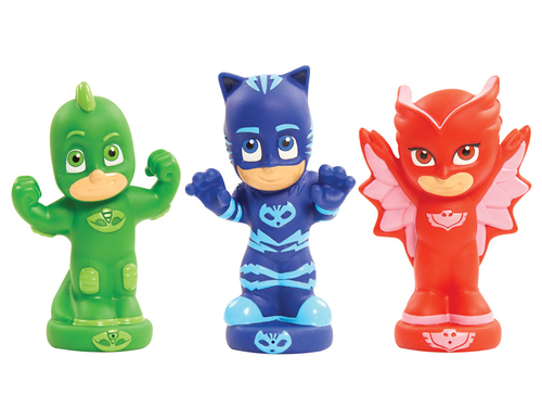 De set bevat 3 PJ Masks-personages (Gufetta, Catboy en Gecko). Ze spuiten water, voelen zacht aan, je kunt ze vullen met water en er stevig in knijpen om de waterstraal eruit te persen.