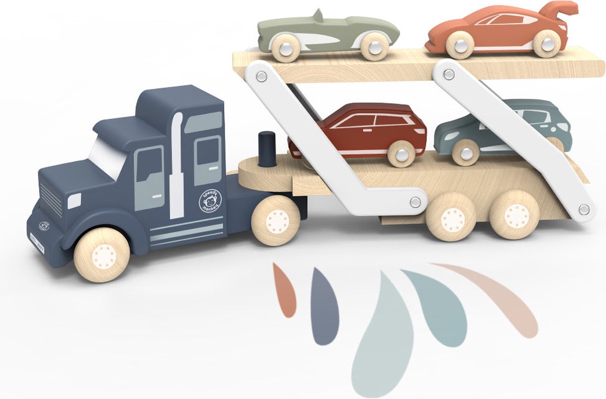 Een tijdloos speelgoed voor kleine autoliefhebbers: de Speedy Monkey Houten Autotransporter beschikt over een slimme dubbeldeks aanhangwagen en vier charmante houten auto’s die klaar zijn om te rijden. Het doordachte ontwerp met sleuven om de auto’s stevig op hun plaats te houden, is ideaal voor fantasierijke roadtrips en actief laadplezier.