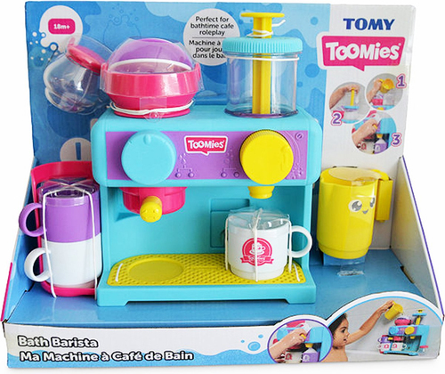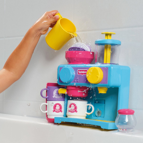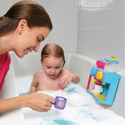 Neem je Koffiemachine mee in bad en word een echte Bad Barista die de lekkerste fantasie-cappuccino’s maakt! Het plezier begint bovenaan: aan de linkerkant staat een spinner die kleintjes in beweging kunnen zetten door er water over te gieten met de meegeleverde smiley kan. Plaats een kopje onder het filter en draai aan het gele handvat om een cappuccino te serveren! Rechtsboven bevindt zich de handige schuimer. Til het deksel op, voeg wat bubbelbad en water toe en begin met het pompen van de gele zuiger om een hoop schuimige belletjes te creëren! Het is zo eenvoudig als 1, 2, 3! Draai aan de gele wijzerplaat en zie het romige schuim in het kopje eronder ploffen. Het is een schuim-accino! Maak het helemaal af met de spikkelshaker, maar wees gerust, de kleurrijke spikkels zullen niet ontsnappen!