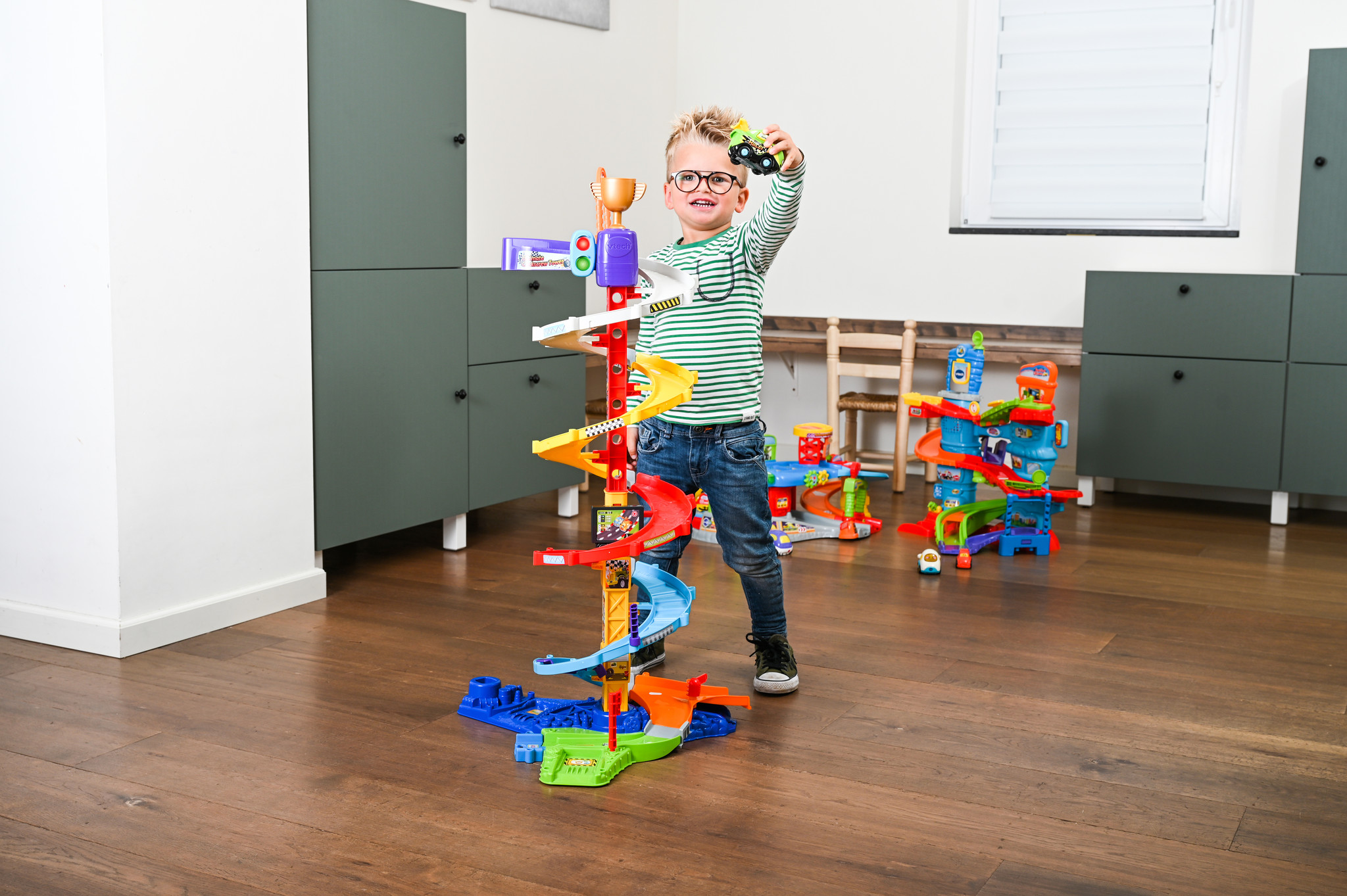 Druk op de gouden trofee om Sam Stuntauto of een andere Toet Toet Auto (apart verkrijgbaar) door het stuntpark te laten racen! Gebruik de routewisselaar om een route te kiezen. Bouw de tornadotoren om in twee racetorens voor nog meer speel- en raceplez
