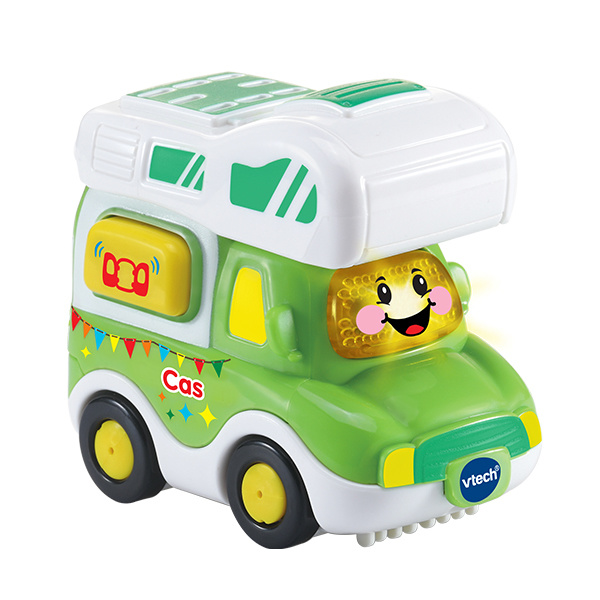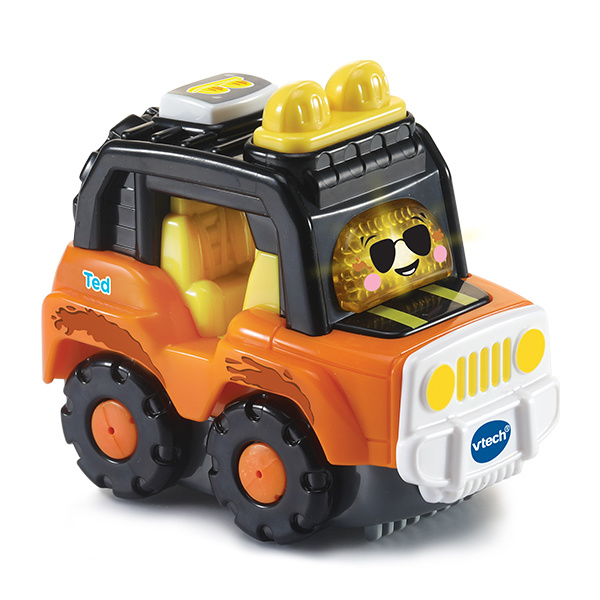 Druk op de knipperende gezicht-toets om geluidseffecten, vrolijke zinnetjes en gezongen liedjes te horen. Druk op de actie-toets om beweging en geluid te activeren. Kom mee en ga samen met Ted Terreinwagen, Pascal Pick-up Truck en Cas Camper overal naa