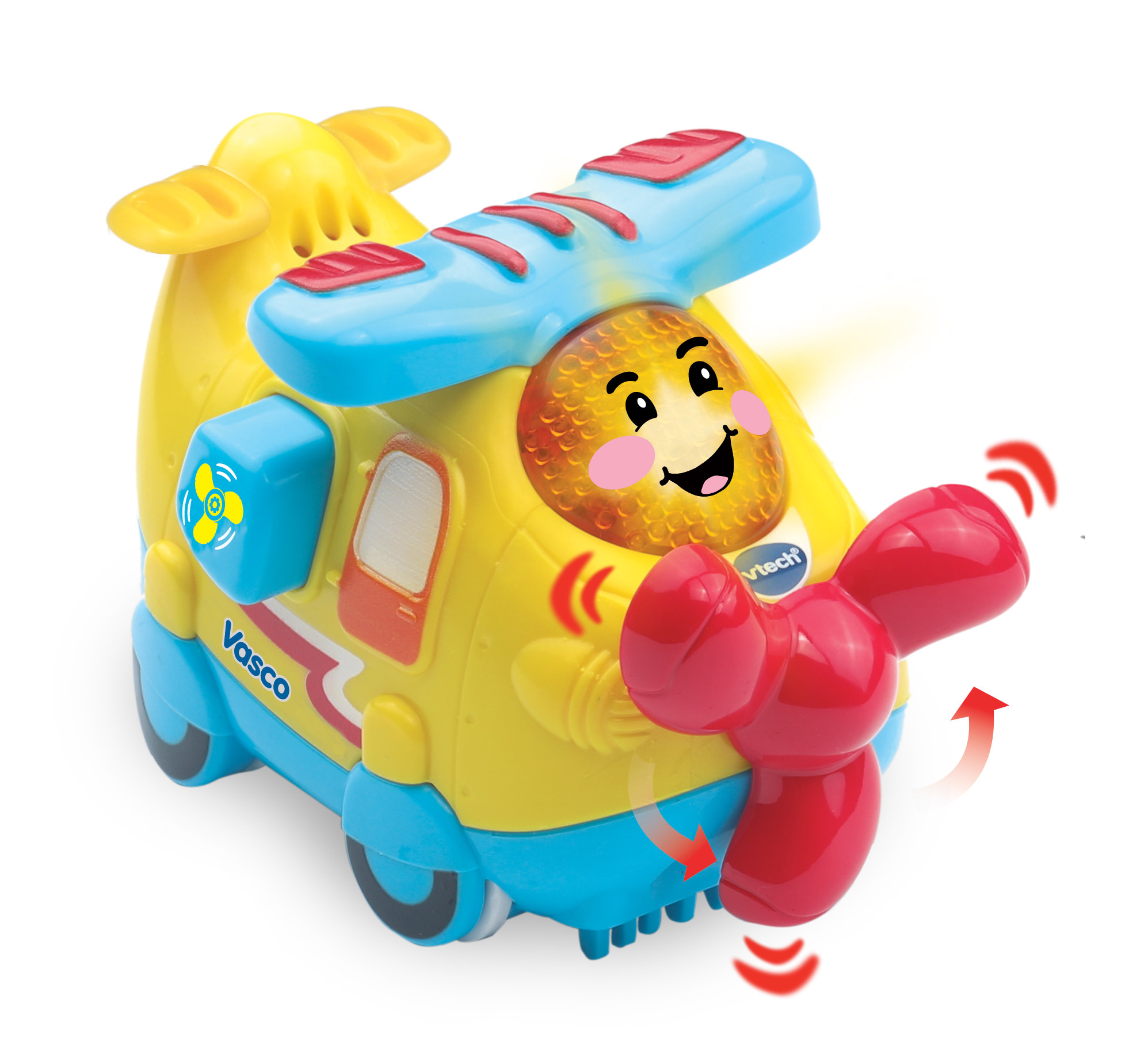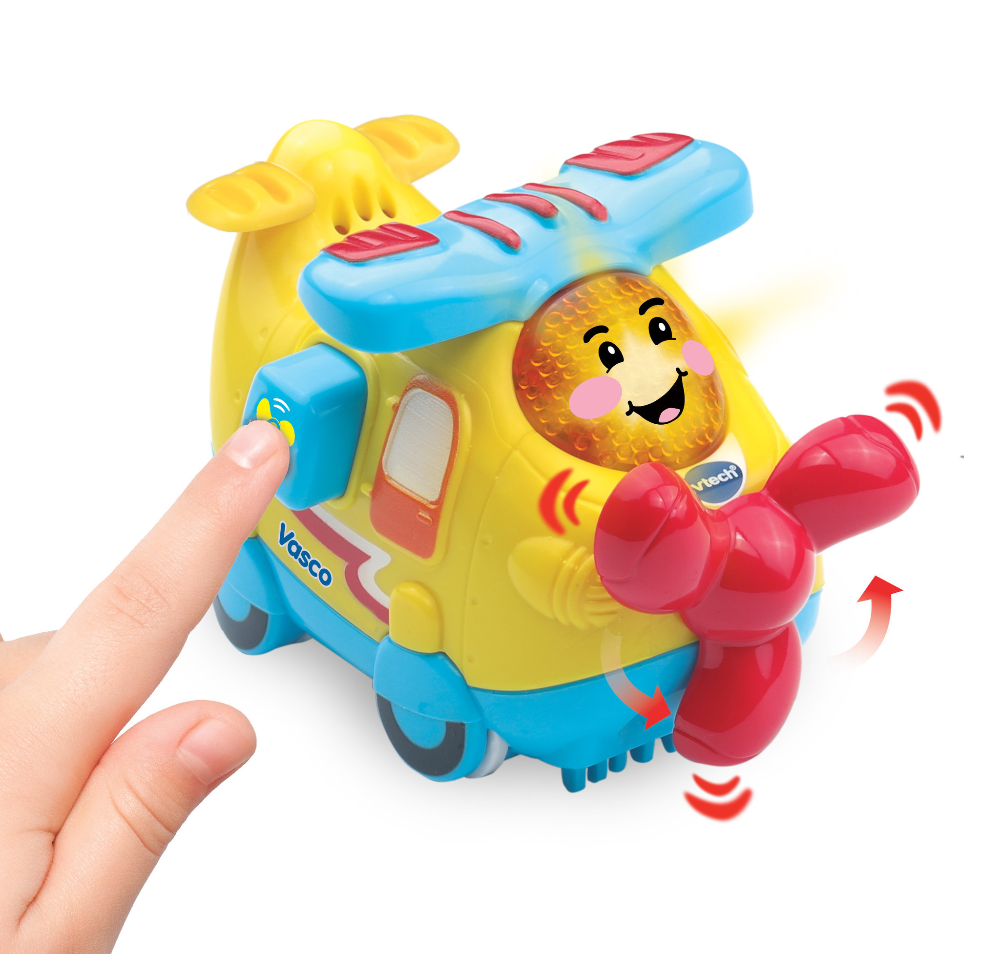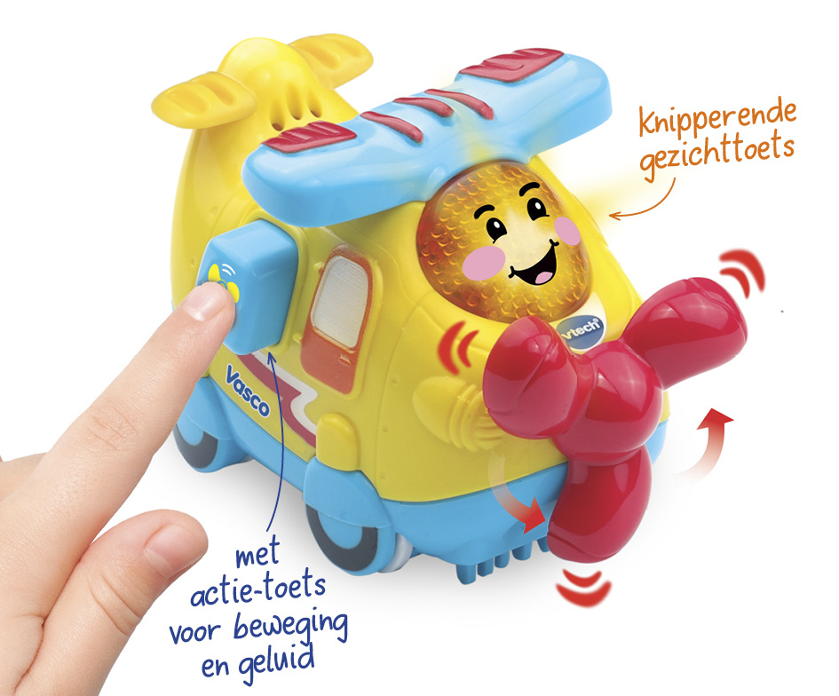 Druk op de knipperende gezichttoets om geluidseffecten, vrolijke zinnetjes en gezongen liedjes te horen. Druk op de actie-toets om de motorkap te openen en grappige geluidjes te horen. Kom en vlieg hoog boven de wolken met Vasco Vliegtuig