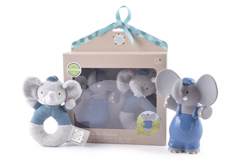Meiya & Alvin – Olifant Elvin squeaker 16cm + rammelaar 13cm (cadeaubox)