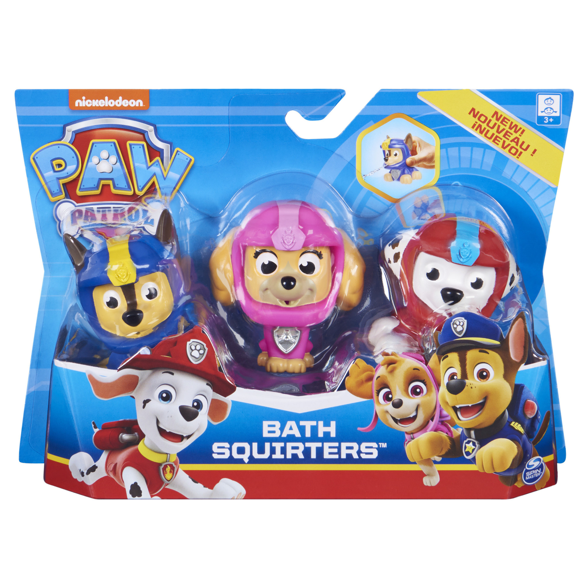 Dankzij de waterspuiters, 3 stuks, kun je nu ook in bad spelen met je favoriete Paw Patrol-pups. De drie waterspuiterpups Chase, Marshall, en Skye in deze set hebben allemaal vrolijke en levendige kleuren, zodat hun uniformen goed opvallen. Ze spuiten ook