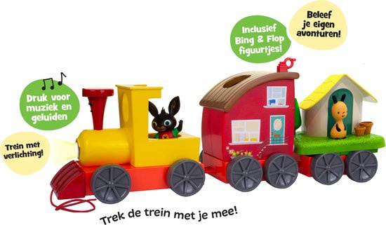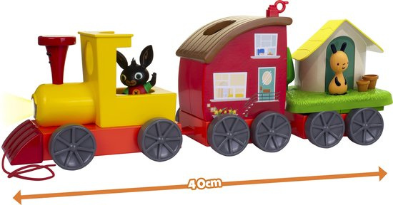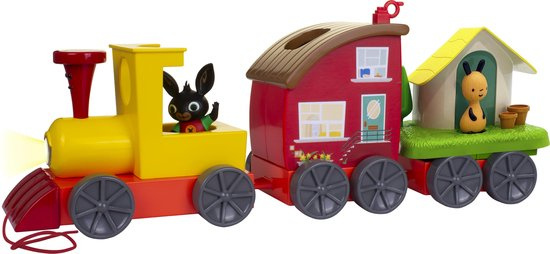 Bing’s Trein met Licht en Geluid bestaat uit 3 onderdelen: een stoomlocomotief en twee wagons. In het eerste wagon vind je Bing’s Huis. Ontkoppel de wagon en speel los met deze speelset. In het huis van Bing staan zijn bank en kast. De achterste wagon is