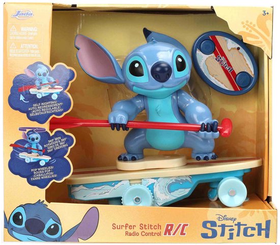 Beleef surfplezier met een twist dankzij de Disney Stitch RC Surfer in schaal 1:24! Deze radiografisch bestuurbare Stitch op zijn surfplank brengt actie en humor samen in een uniek ontwerp. Makkelijk te besturen en klaar voor avontuur, perfect voor jonge fans van Disney’s ondeugende buitenaardse held.