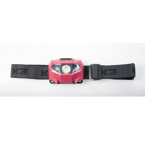 Lichte en compacte hoofdlamp met verstelbare hoofdband. Keuze tussen continu wit of rood licht en knipperende seinlamp. Spatwaterdicht. Verstelbaar in een hoek van 60°.Met 1 knop te bedienen. Werkt op 3 AAA batterijen