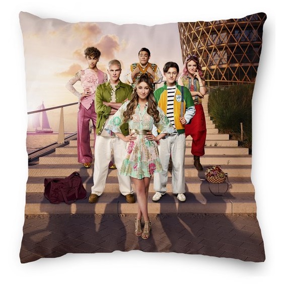 Ultrazacht 40x40cm #LikeMe vierkant sierkussen met aan de voorkant de groepsfoto en aan de achterkant het logo van #LikeMe.