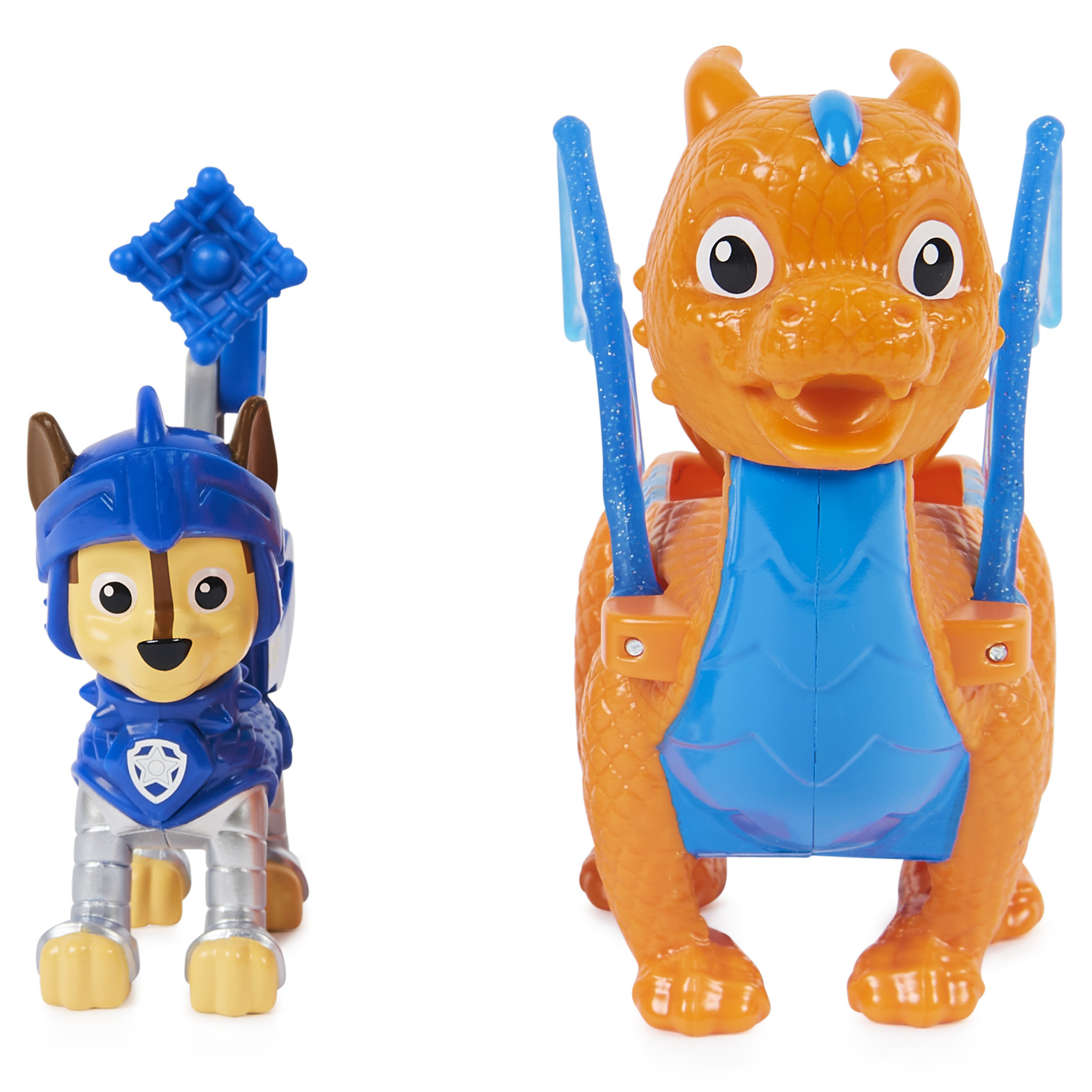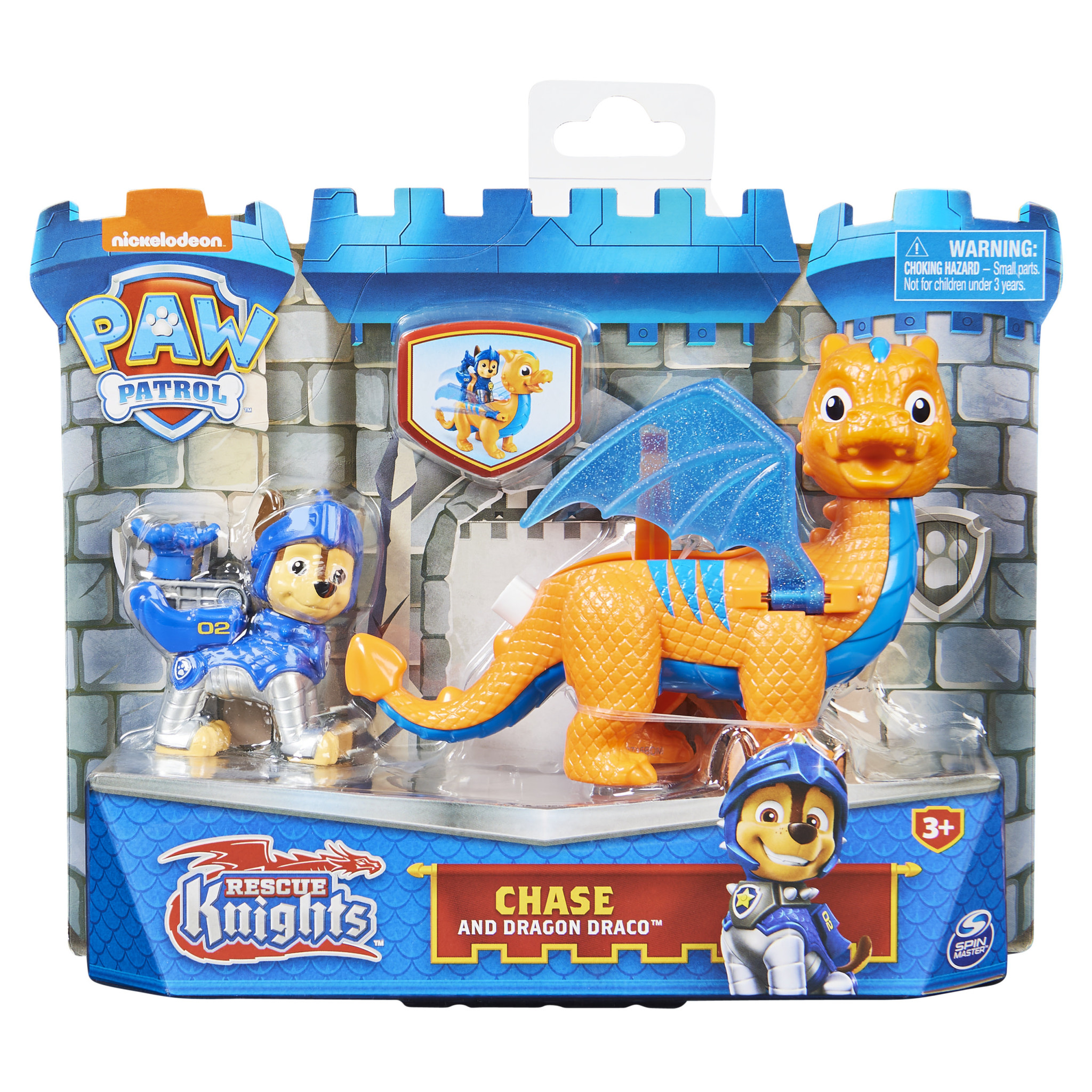 PAW Patrol reist naar de middeleeuwen. Ga mee met je favoriete pups en hun nieuwe drakenvriendjes, en beleef spannende reddingsmissies met de Rescue Knights Pup & Draak-sets. Deze set actiefiguren bevat een pup en zijn trouwe drakenvriendje. De geliefde pup van PAW Patrol draagt zijn Rescue Knights-harnas en is klaar om in actie te komen. Druk op de badgeknop om het gereedschap in zijn rugzak te transformeren en open te klappen. Klem de pup vervolgens op de rug van draak en druk op de knop op de staart om de glinsterende, doorzichtige vleugels te laten bewegen. Deze geweldige set brengt al het middeleeuwse plezier van de populaire tv-serie tot leven. Verzamel alle Rescue Knights Pup & Draak-sets, elk afzonderlijk verkocht, en gebruik je fantasie om keer op keer je eigen reddingsmissies te verzinnen. Verken het transformerend Kasteel, speelset wordt afzonderlijk verkocht, voor nog meer speelmogelijkheden. De Rescue Knights PAW Patrol-actiefiguren en -draken zijn het perfecte speelgoed voor jongens en meisjes. Inhoud: 1 Paw Patrol-figuur, 1 draakfiguur