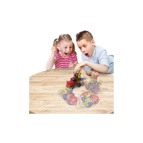 Elke speler pakt 6 stoelen van één kleur. Zet de schakelaar op ‘aan’ en het spel begint. Zie hoe Pete rondjes begint te rijden. Weet jij je stoelen tactisch en effectief te stapelen?