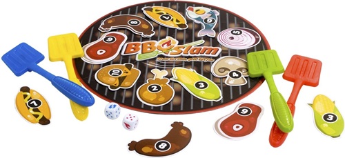 Clown Games BBQ Slam: het slimme spel waar je honger van krijgt! Gooi met de dobbelstenen en tel de ogen bij elkaar op. Nu moet je zo snel mogelijk met je spatel op het kaartje slaan, met het corresponderende getal. Heb je de goede? Dan win je de kaart. Maar maak geen fouten… De speler, die als eerste 6 ingrediëntenkaartjes met opéénvolgende getallen verzamelt, wint het spel!