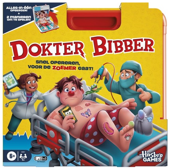 Snel opereren, voor de ZOEMER gaat! Dit is het populaire kinderbordspel met spannende nieuwe functies! Bij deze editie van het spel Dokter Bibber kies je uit twee manieren om te spelen: klassiek spel in Ziekenhuismodus of een superspannende, gekke Spoedmodus. In Ziekenhuismodus trekken kleine dokters Verbandkaarten met gekke kwalen. Het wordt steeds spannender, want ze moeten hun handen zo stil mogelijk houden terwijl ze Sam opereren. Anders gaat de zoemer af en gaat zijn neus branden! In Spoedmodus gaat het erom zo snel mogelijk zoveel mogelijk kwalen te verwijderen, voordat de tijd om is. Maar let op! Als de pincet de zijkant raakt, gaat Sam boeren, huilen en maakt hij andere hysterische geluiden die een vrolijke lach oproepen bij kinderen! In beide modi wint degene die de meeste kwalen verwijdert en de patiënt ‘beter’ maakt. Dit onweerstaanbare spel zit in een alles-in-één draagkoffer met opbergruimte, dus een geweldig reisspel voor kinderen, voor elk moment en overal.