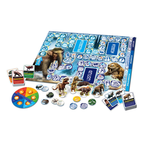 Het speelbord kan aan 2 zijden worden gebruikt: aan de ene kant staan de prehistorische tijdperken met de dinosaurussen, aan de andere kant de ijstijd en de eerste zoogdieren.