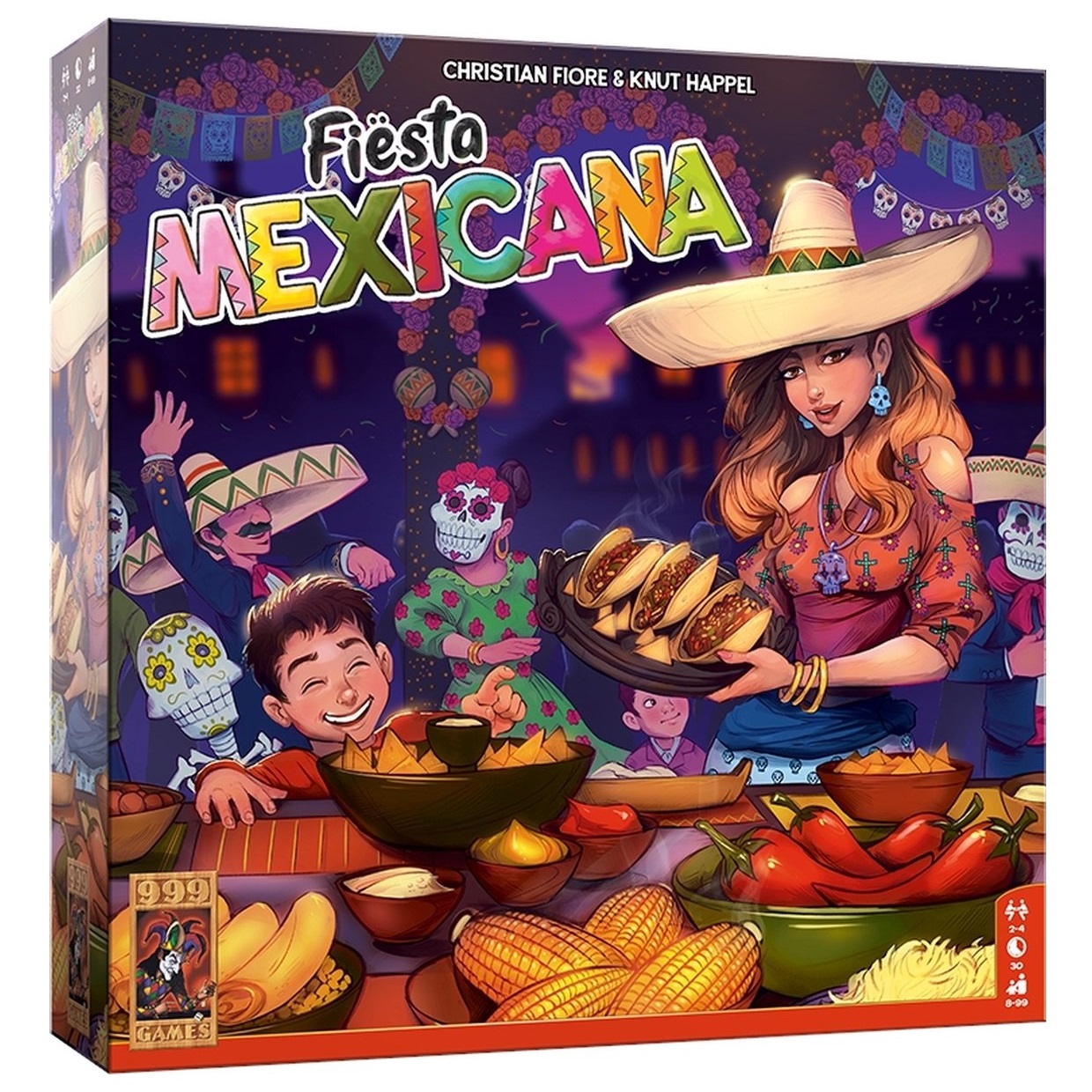 In dit feestelijke familiespel organiseer je jouw eigen Mexicaanse feestje. Je verzamelt voor je gasten gerechten, die je op je eigen tafel serveert. Sommige gasten hebben bepaalde wensen, zoals de juiste dipsaus of het grootste aantal burrito’s. Elk gerecht wordt geveild. Alleen als jij het juiste bod op het gerecht doet, mag je het op je tafel zetten. Fiësta Mexicana is een originele combinatie van puzzelen en bieden. Je biedt niet met geld, maar met plekken op je tafel. Elke plek heeft een andere waarde. Hoe hoger de waarde, des te groter de kans dat jij het huidige gerecht erop mag serveren. Maar die waarde staat niet vast. Door je tafel een kwartslag te draaien, krijgen alle plekken een andere waarde. Zo ben je voortdurend bezig om met het juiste bod een gerecht in handen te krijgen. Wenskaarten van gasten geven aan waar jij extra punten mee kunt verdienen. Sommige tegels bepalen bijvoorbeeld dat je minstens drie gerechten van hetzelfde soort op rij moet proberen te bemachtigen. Ook krijg je minpunten als tegels met dipsaus niet goed op elkaar aansluiten. Je moet er daarom niet alleen voor zorgen dat jij genoeg gerechten op tafel krijgt, maar ook nog eens dat de juiste gerechten op de goede plekken staan.