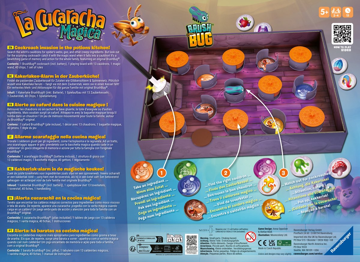 Betreed een magische wereld vol spanning met La Cucaracha Magica! In dit razendsnelle geheugen- en reactiespel zwaai je met je toverstaf om magische drankjes te brouwen, terwijl een wendbare elektrische kakkerlak – de BrushBug – onverwacht door het driedi