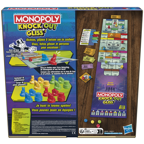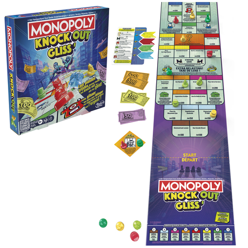 Het spel Monopoly Knockout is een gezinspartyspel met glijdende pionnen en het plezier van snel geld verdienen! Deze versie van het Monopolyspel waarin van alles gebeurt, strijd je tegen tegenstanders in een pionnenwedstrijd! Spelers spelen in rondes en laten om de beurt hun pionnen over het lange spelbord (meer dan 90 cm!) glijden, om ze te laten eindigen op bezittingen. Aan het einde van elke ronde ontvangen – of betalen – ze geld, afhankelijk van waar hun pionnen beland zijn. Laat ze dus voorzichtig glijden, zodat ze eindigen op de beste bezittingen en duw pionnen van andere spelers in de Gevangenis of helemaal van het bord. De speler die aan het eind van het spel het meeste geld heeft, wint! Op zoek naar een partyspel voor kinderen en volwassenen of leuke spellen voor een spelavond? Dit licht strategische spel is ideaal voor familiebijeenkomsten, vakanties en meer. De namen en logo’s van Hasbro Gaming, Parker Brothers en Monopoly, het kenmerkende ontwerp van het spelbord, de vier hoekvakjes, de naam Mr. Monopoly en het figuurtje, evenals elk van de kenmerkende elementen van het bord en de pionnen zijn handelsmerken van Hasbro voor haar beroemde gezelschapsspel en toebehoren.
