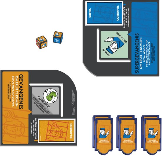 Misdaad loont! De uitbreiding Monopoly Naar de gevangenis geeft een frisse twist aan het Monopoly-spel en verkort de speeltijd tot de helft. Voeg gewoon het opzetstuk van de uitbreiding toe aan het klassieke Monopoly-spelbord om de vakjes Gevangenis en Naar de gevangenis te veranderen in de gewenste locaties. Als ze op die vakjes staan, kunnen spelers Corruptiekaarten of Supercorruptiekaarten verzamelen, waarmee ze wegkomen met gemene streken én voordelen scoren die andere spelers niet hebben! Het spel eindigt wanneer alle bezittingen verkocht zijn of wanneer een speler failliet is. De rijkste speler wint! Pak deze spannende Monopoly-uitbreiding erbij voor een spelavond met het gezin, vakanties en snel plezier op elk moment. (Om te spelen, moet je het klassieke Monopoly-spel in huis hebben. Afzonderlijk verkrijgbaar.)