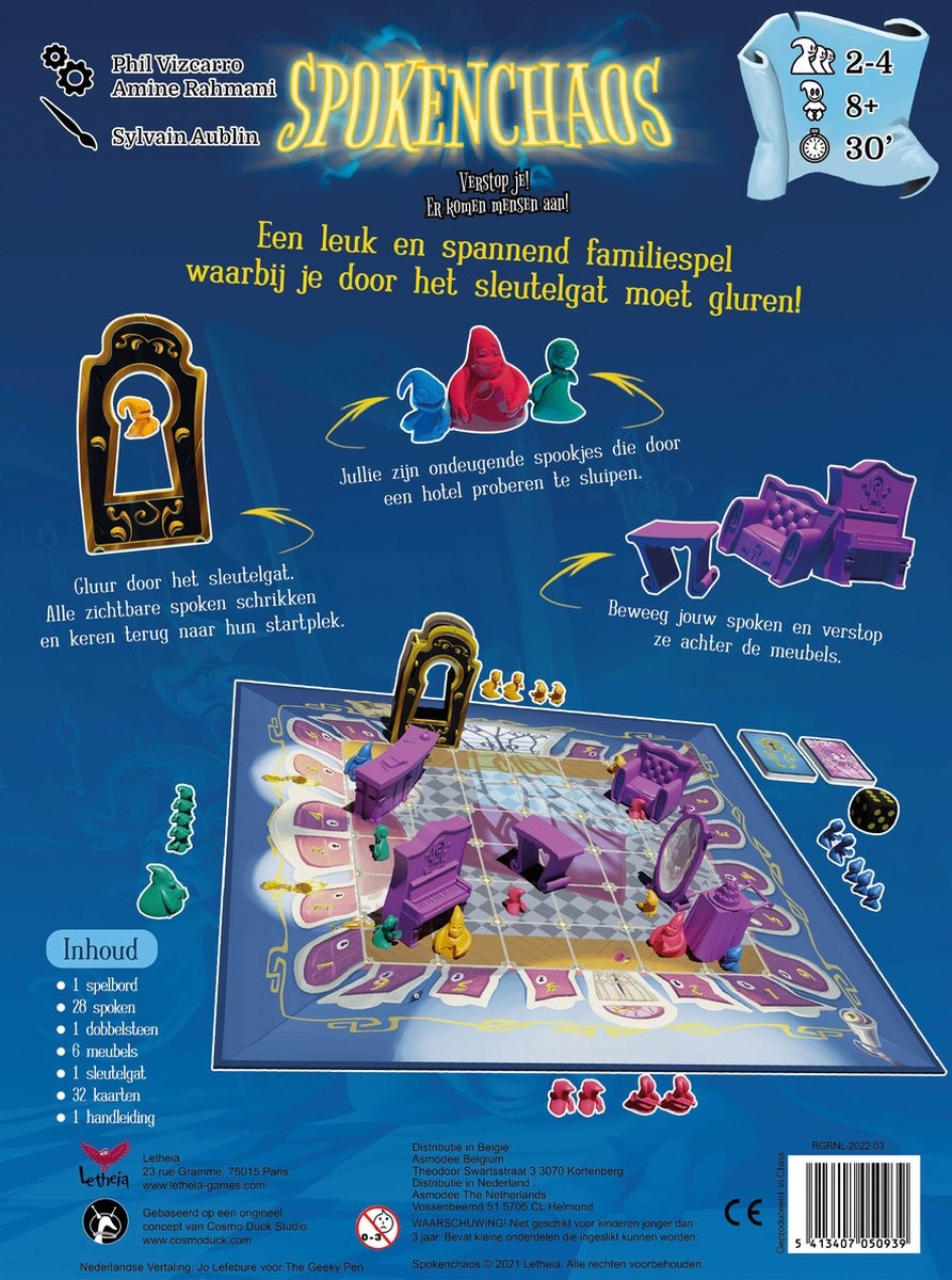 Spelers proberen hun spoken ongezien de lobby over te laten steken. Verplaats het meubilair en verstop je spoken erachter, maar let op: je medespelers proberen er voor te zorgen dat jouw spoken betrapt worden. Probeer jouw spoken naar buiten te laten glippen door aan de aandacht van de mensen te ontsnappen! Voor meer variatie kun je extra kaarten toevoegen en spoken samenvoegen.