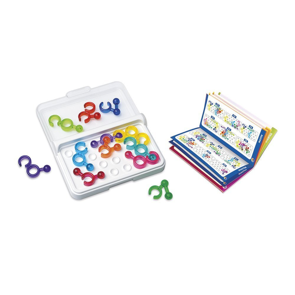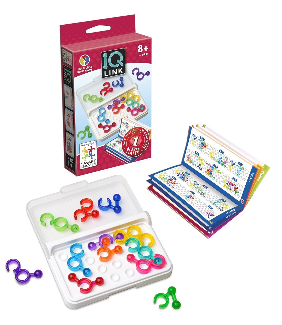 Ga slim te werk en pas alle puzzelstukken op het spelbord. Maar let op! Er zijn 36 puzzelonderdelen maar slechts 24 plaatsen op het bord! Open ringen en bollen van verschillende puzzelstukken kunnen op dezelfde plaats gelegd worden. Maar enkel wanneer je ze op de juiste manier aan elkaar linkt. IQ-Link is een compact reisspel en het meest uitdagende denkspel in de reeks IQ-puzzels van SmartGames. Bovendien ogen de gekleurde, doorzichtige puzzelstukken fantastisch. Inhoud: 12 kleurrijke puzzelstukken, compact spelbord met transparant deksel, boekje met 120 opdrachten.