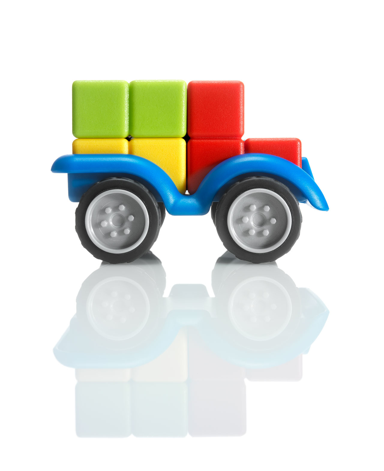 Kan jij een auto volgens plan in elkaar zetten? Bouw een auto door alle blokken op het chassis te zetten. De plaats van de blokken moet overeenkomen met de kleurinformatie die in de opdracht gegeven is. Plaats de 4 blokken op de juiste plaats en maak e