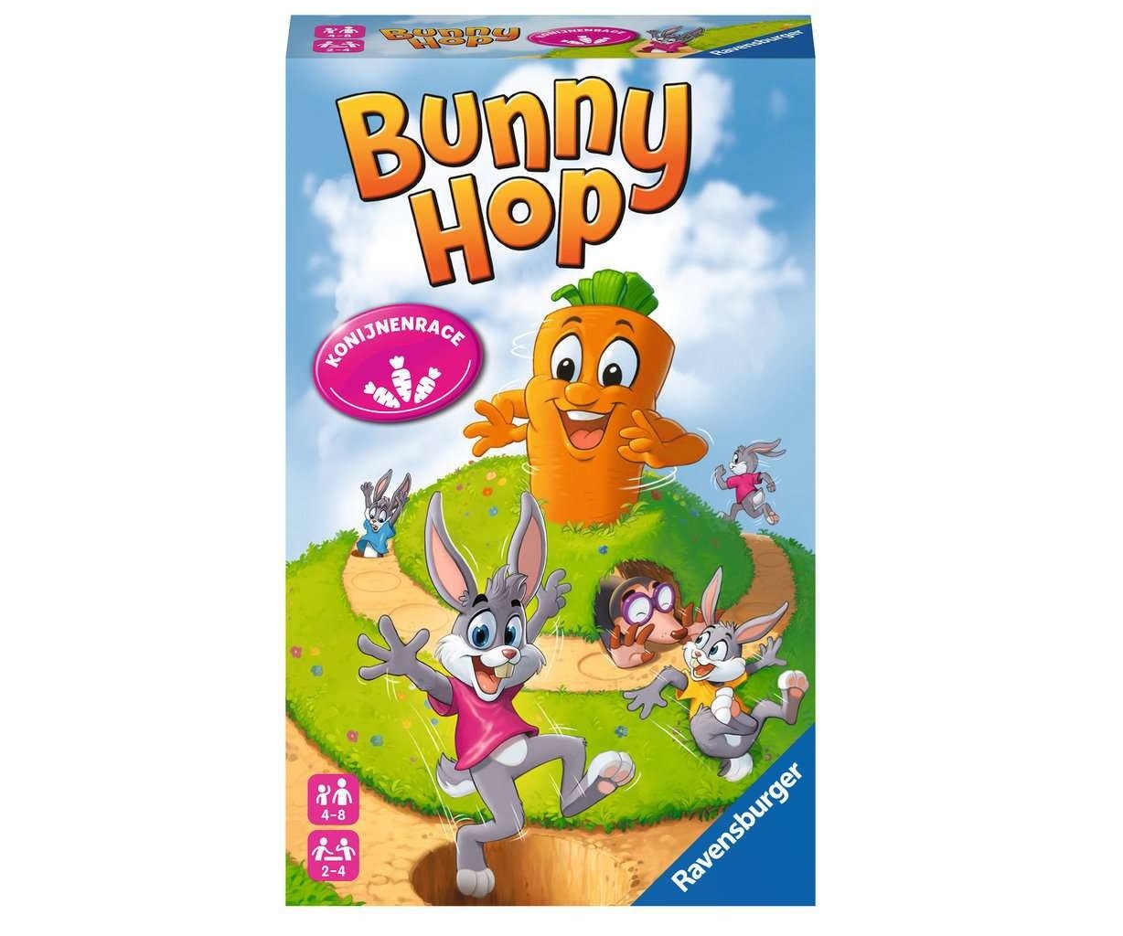Bij de spannende race naar de wortel bepaalt het geluksrad hoe ver de konijnen mogen huppen. Op de veilige velden gaat het snel vooruit. Maar hopla! Valt een konijn in een gevaarlijk gat, dan begint hij weer van vooraf aan!